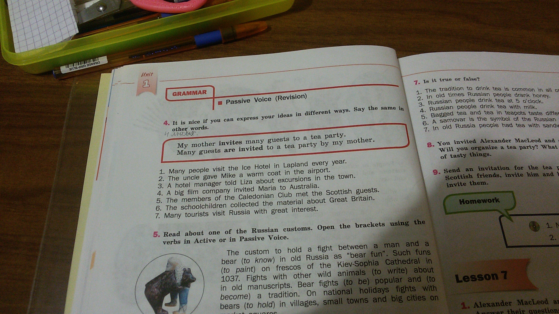 1) The Ice Hotel is visited by many people every year. 2) The material about Great Britain was collected by the schoolchildren. 3) A warm coat was given Mike by the uncle in the airport. 4) Maria was invited by a big film company to Australia.