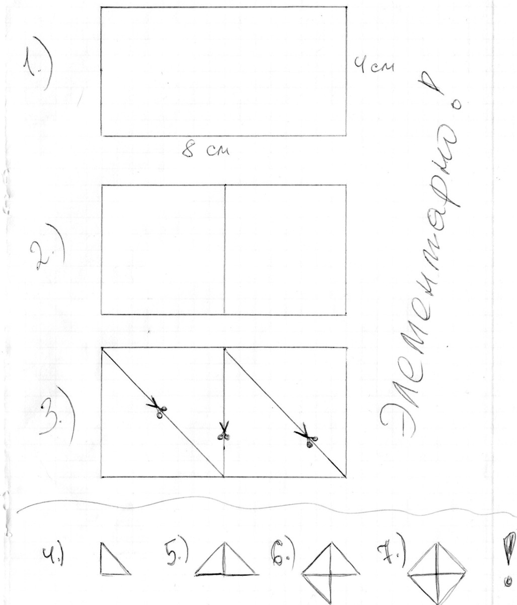 вырежи из бумаги прямоугольник со сторонами 8 и 4 см. Раздели его на 4 треугольника и составь из них квадрат