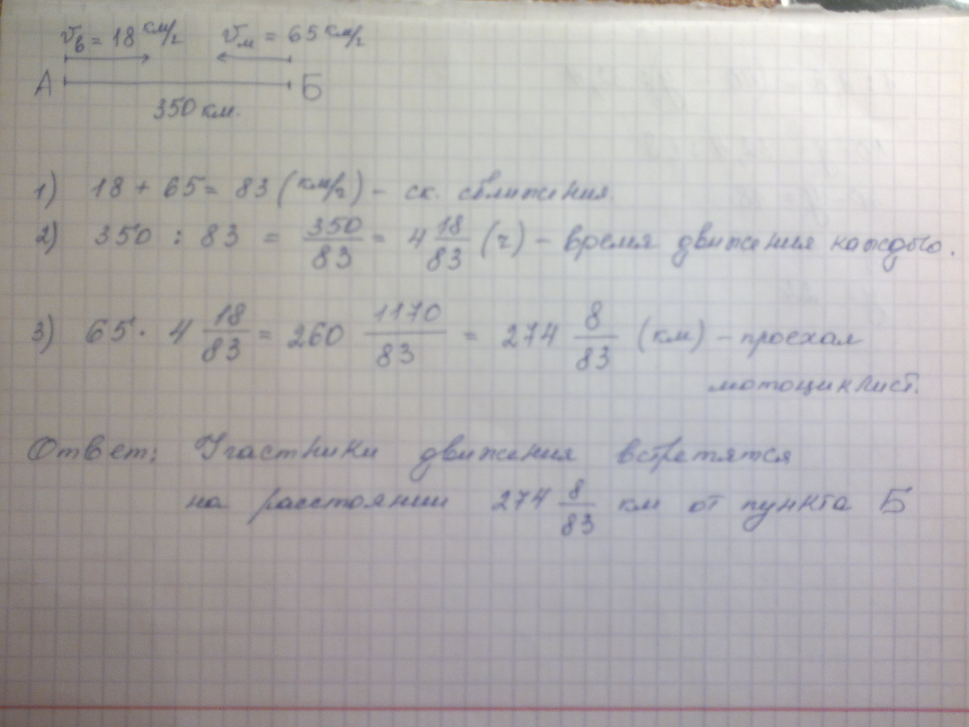 Из пункта А в пункт Б выехал велосипедист со скорость 18 кмч. Навстречу из пункта Б в пункт А выехал мотоциклист со скоростью 65кмч. На каком расстоянии от пункта Б они встретятся, если между А и Б 350 км