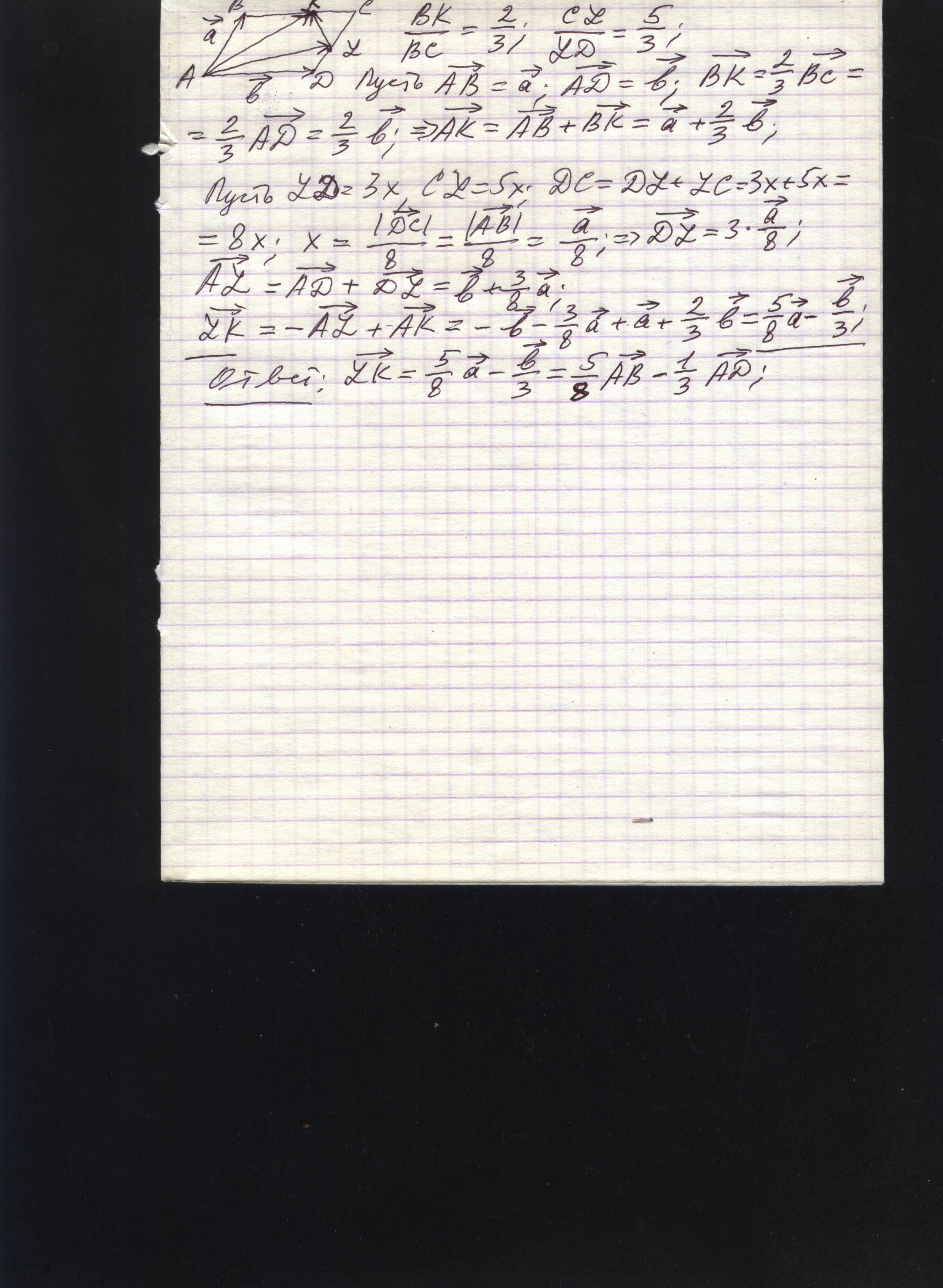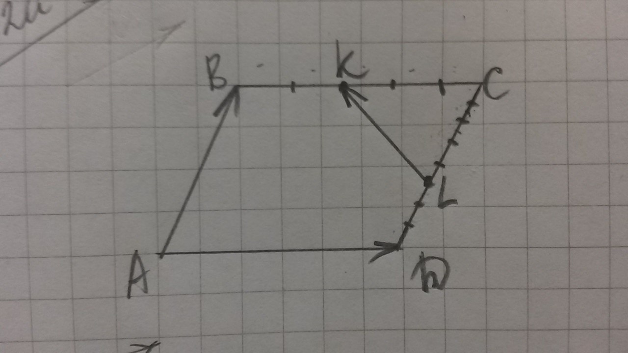 В параллелограмме ABCD точка K принадлежит BC и BK:BC=2:3,точка L принадлежит к CD и CL:LD=5:3.Выразите вектор LK через неколлинеарные векторы AB и AD.