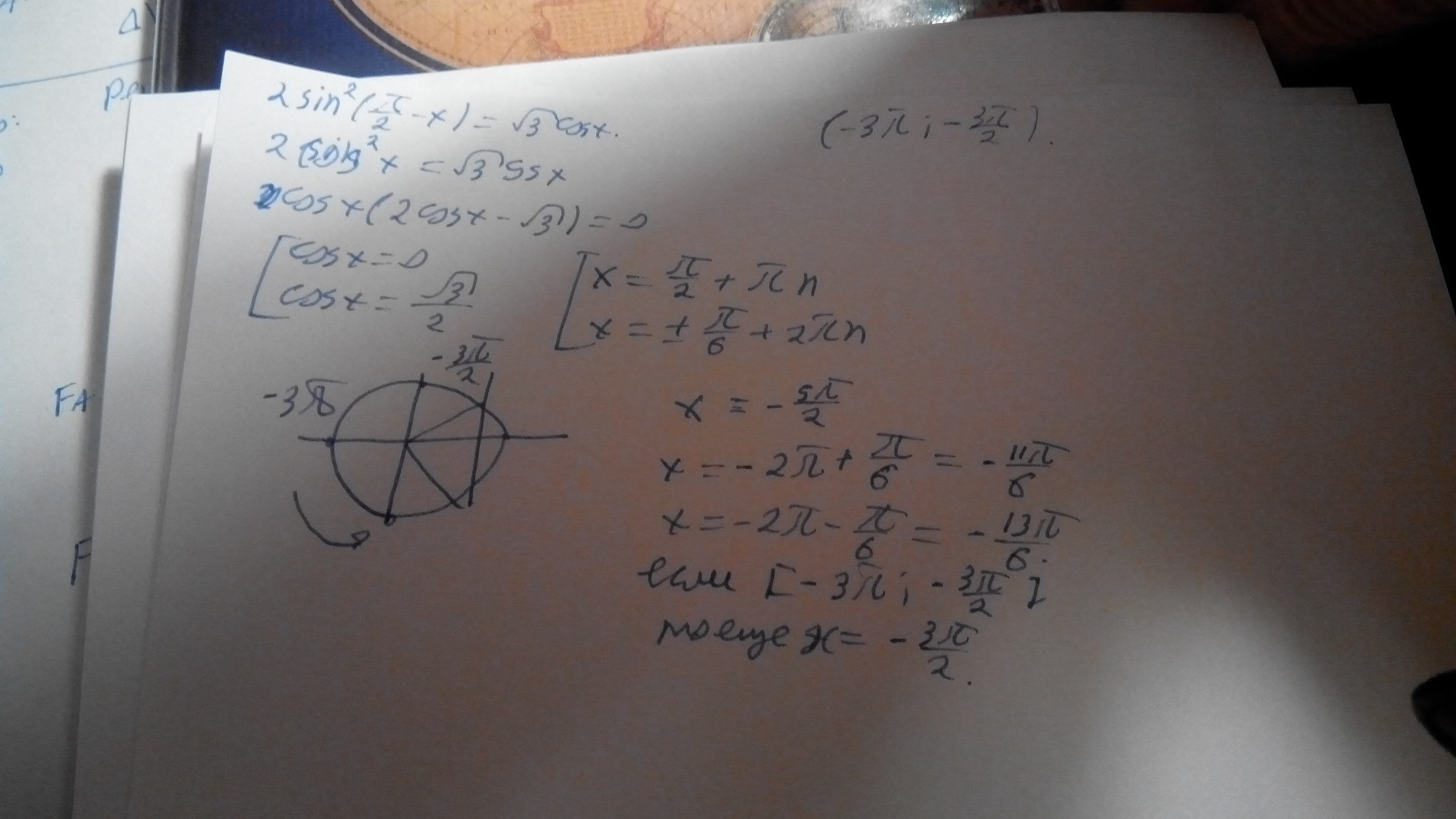 Пожалуйста решите уравнение 2sin^2(П/2-х)=-√3cosx
