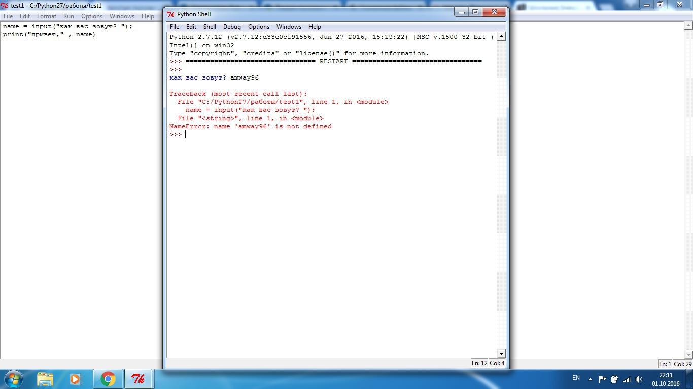вы в интерпретаторе пайтона 2.7 пишете в стиле 3.х, а это уже совсем другая версия.