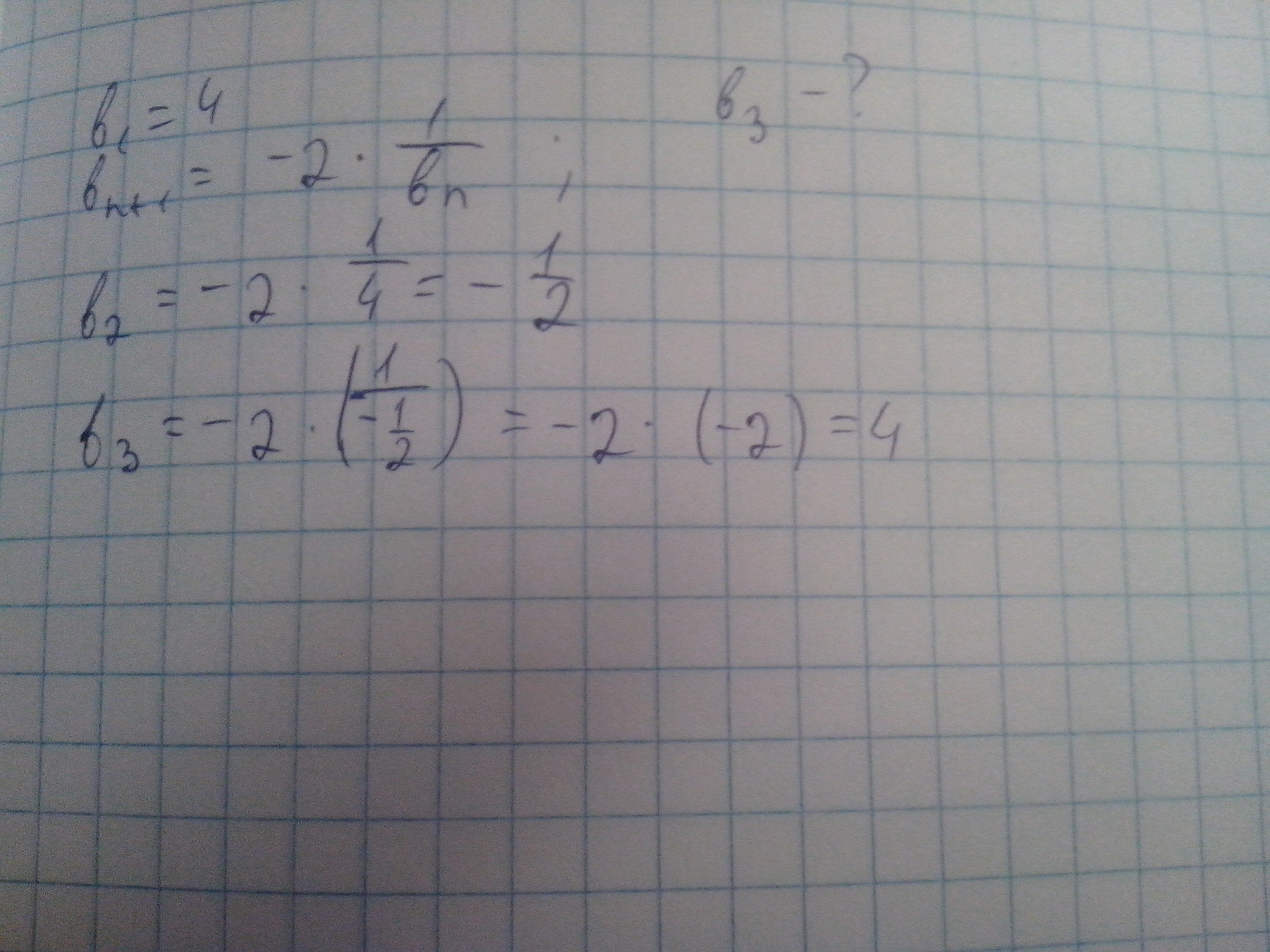 bn+1=-2*1/bn подставляем b1=-4 : b2=-2 *1/-4;b2=3/4 .b3 аналогично b3=-3*1/ 3/4 ;b3= -4