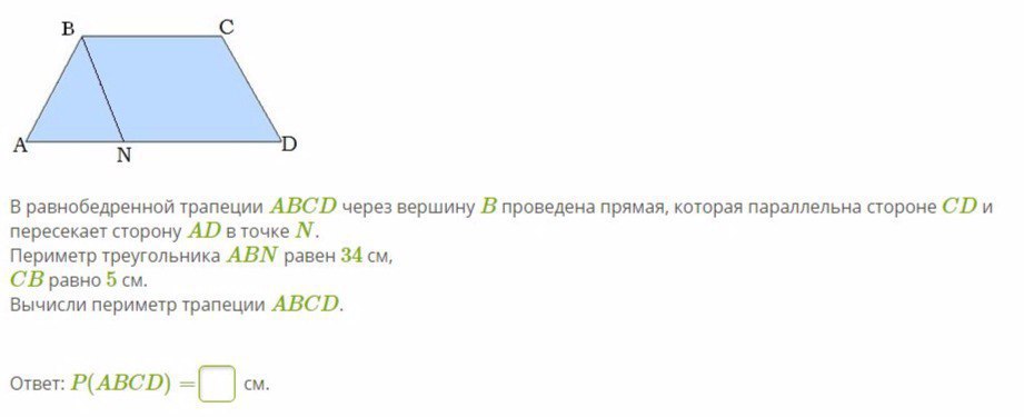 NBCД - параллерограмм, так как ВС параллельна NД, а ВN параллельна СД, значит: ВN=CД; ВС=NД. Периметр АВСД=АВ+ВС+СД+АД; BC=NД=5 см; АД=AN+NД=AN+5; Периметр АВСД=АВ+5+BN+AN+5; так как периметр АВN=AB+BN+AN=34 см, то периметр АВСД=34+5+5=44 см;