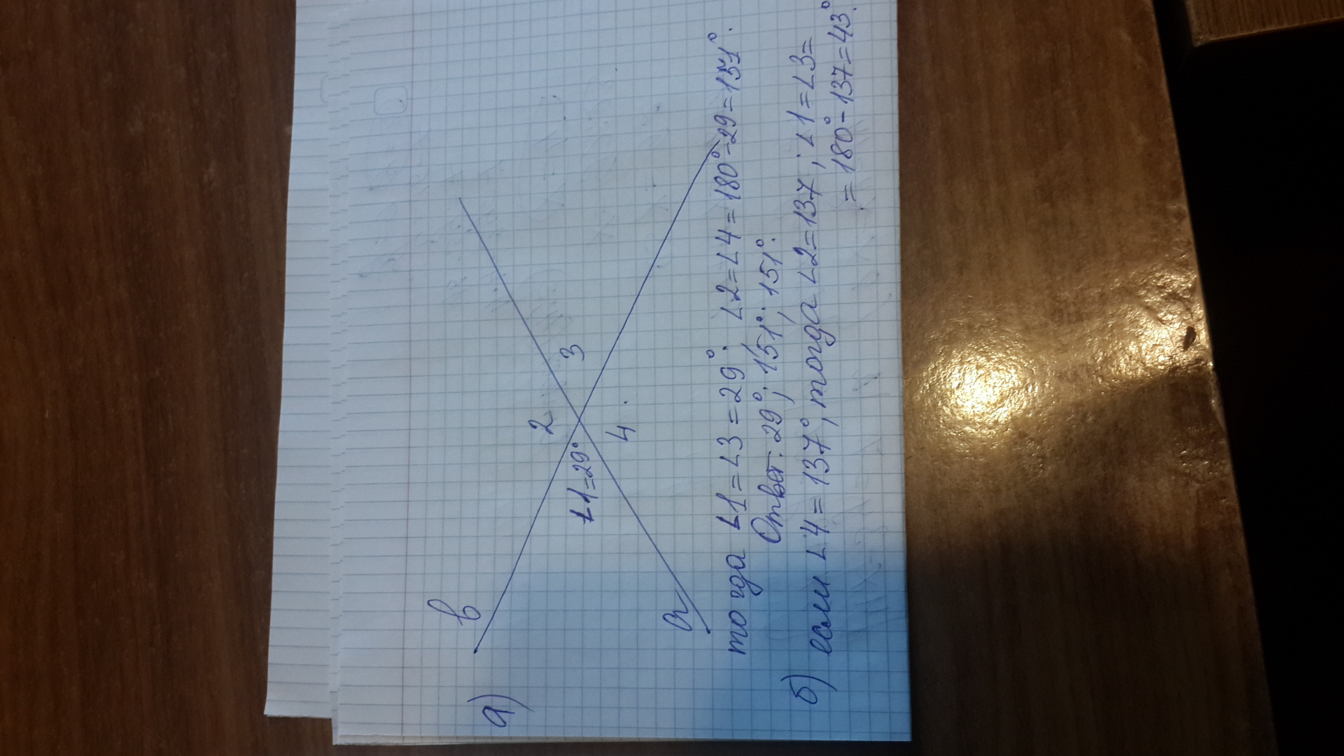 ДАЮ 25 БАЛЛОВ! На рисунке изображены две пересекающиеся прямые a и b .Найдите величины трех углов ,если а)угол 1=29 градусов. б)угол 4=137 градусов