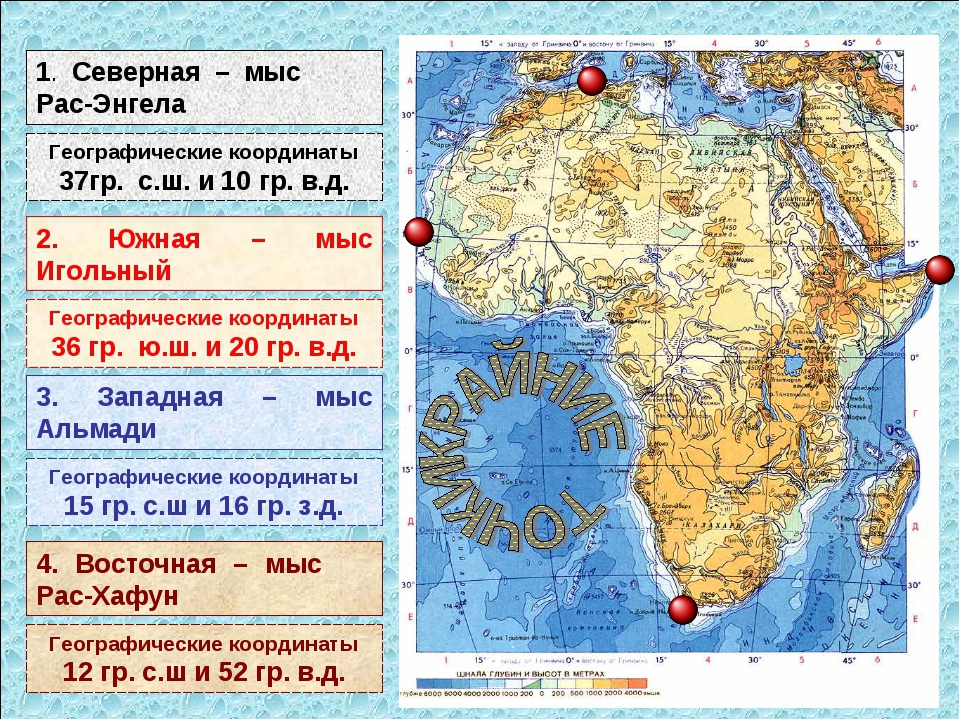 Які координати географічних точок: Рас-Енгала(Африка), мис Голковий(Африка), мис Альмаді(Африка), Рас-Гафун(Африка).