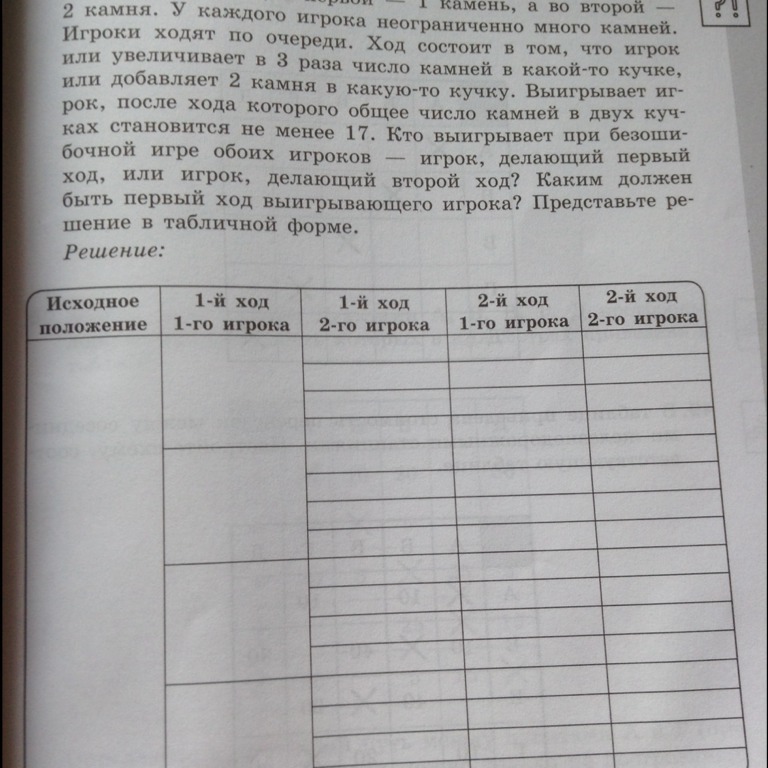 Два игрока играют в следующую игру . Перед ними лежат две кучки камней , в первой -1 камень , а во второй 2 камня . У каждого игрока неограниченное количество камней . Игроки ходят по очереди . ЭТО недостающий кусок