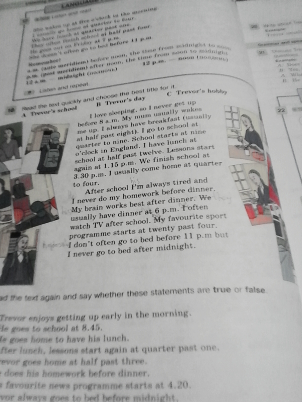 (S)he loves sleeping, so (s)he never gets up before 8 a.m. (Her) his mum usually wakes (her) him up. (S)he always has breakfast (usually at half past eight). (S)he goes to school at quarter to nine. School starts at nine o'clock in England. (S)he has lunch at school at half past twelve. Lessons start again at 1.15 p.m. They finish school at 3.30 p.m. (S)he usually comes home at quarter to four.