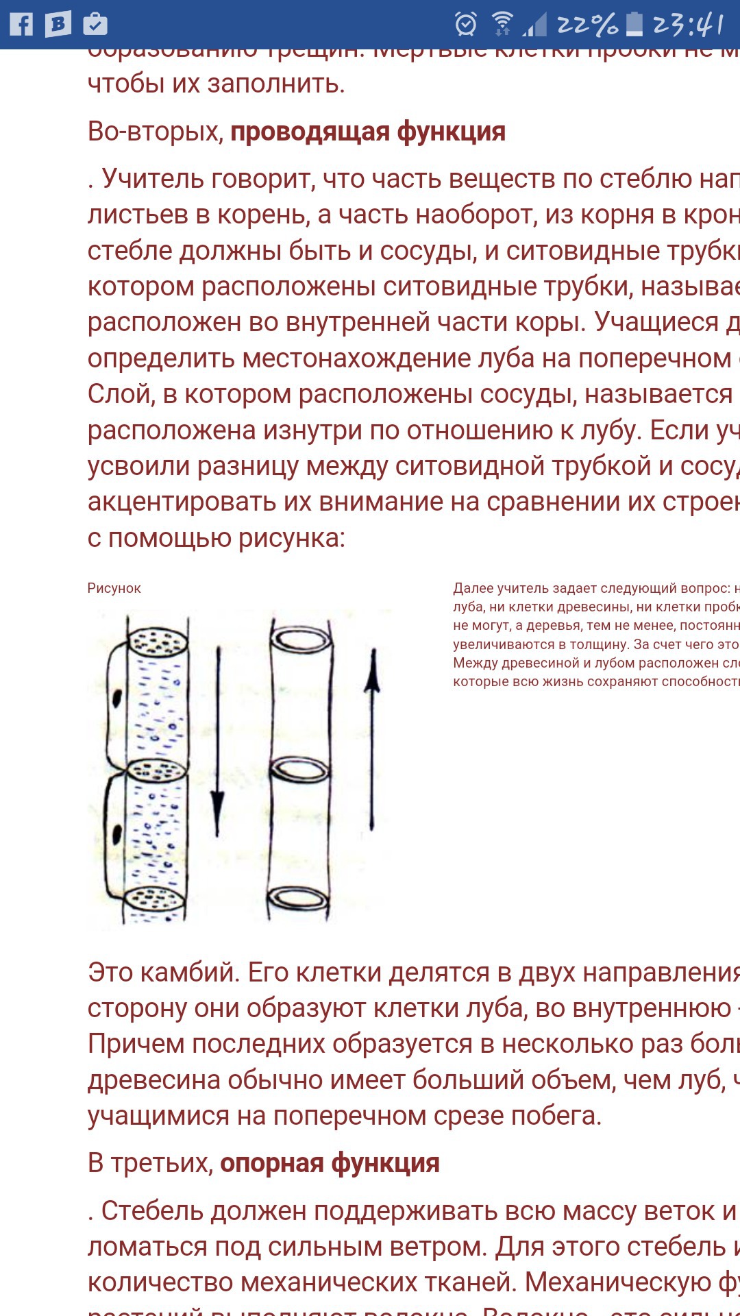 . Учитель говорит, что часть веществ по стеблю направляется из листьев в корень, а часть наоборот, из корня в крону. Значит, в стебле должны быть и сосуды, и ситовидные трубки. Слой, в котором расположены ситовидные трубки, называется луб. Он расположен во внутренней части коры. Учащиеся должны определить местонахождение луба на поперечном срезе побега. Слой, в котором расположены сосуды, называется древесина. Она расположена изнутри по отношению к лубу. Если учащиеся плохо усвоили разницу между ситовидной трубкой и сосудом, можно акцентировать их внимание на сравнении их строения. Например, с помощью рисунка:
