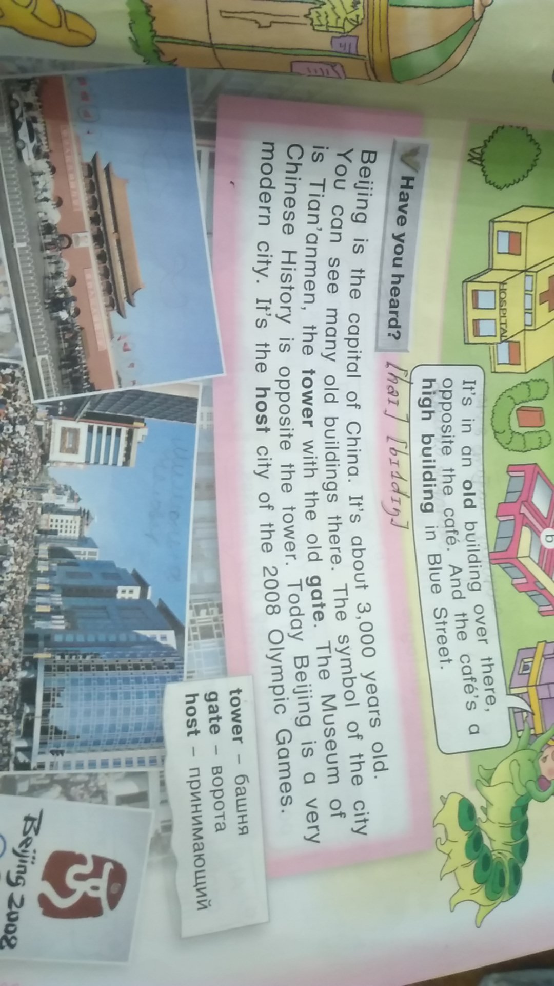 Пекин - это столица Китая. Ему около 3000 лет. Здесь ты можешь увидеть много старинных зданий. Символ города - Тяньаньмэнь, башня со старинными воротами. Музей Китайской Истории находится напротив башни. Сейчас Пекин очень современный город. Это город, принимавший Олимпийские игры в 2008 году. (Немного коряво переведено последнее предложение)