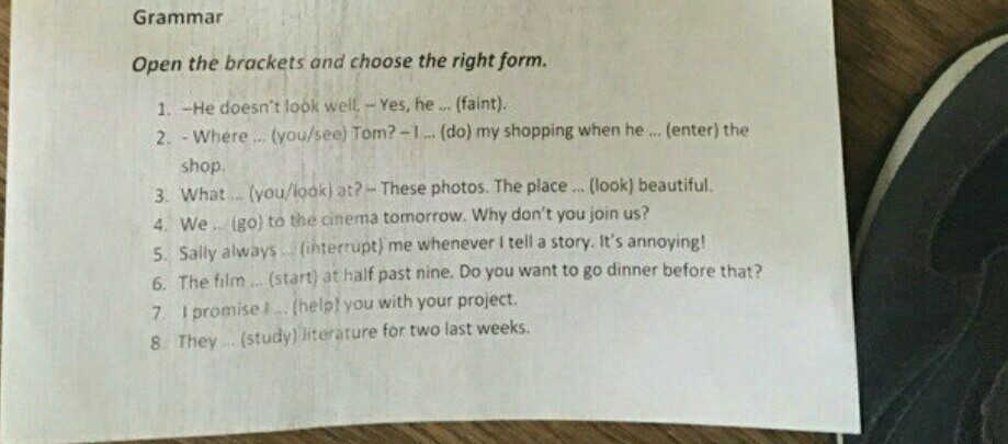 1 Yes, he has fainted. 2 Where did you see Tom? – I did my shopping when he was entering the shop. 3 What are you looking at? -…The place looks beautiful. 4 We are going to the cinema tomorrow. 5 Sally always interrupts me… 6 The film starts at half past nine. 7 I will help you with your project. 8 They were studying literature for two last week. 9 I will get it. 10. She has a nice puppy for one month now.