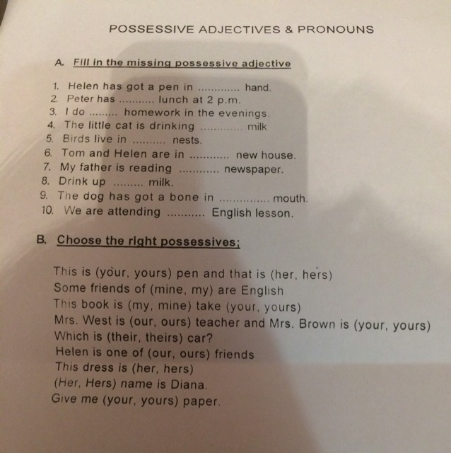 A 1 her; 2 his; 3 my; 4 its; 5 their; 6 their; 7 his; 8 your; 9 its; 10 our