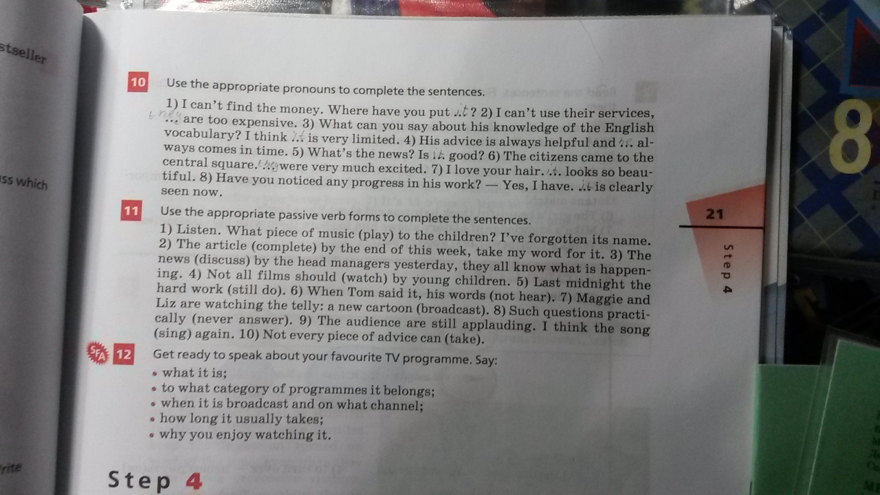 1 is being played; 2 will have been completed; 3 was discussed; 4 be watched; 5 had still