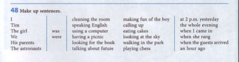 1. I was cleaning the room at 2 p.m. yesterday. 2. Tim was using a computer the whole evening. 3. The girl was looking for the book an hour ago. 4. We were speaking English when she rang. 5. His parents were having picnic when I came in. 6. The astronauts were looking at the sky an hour ago.