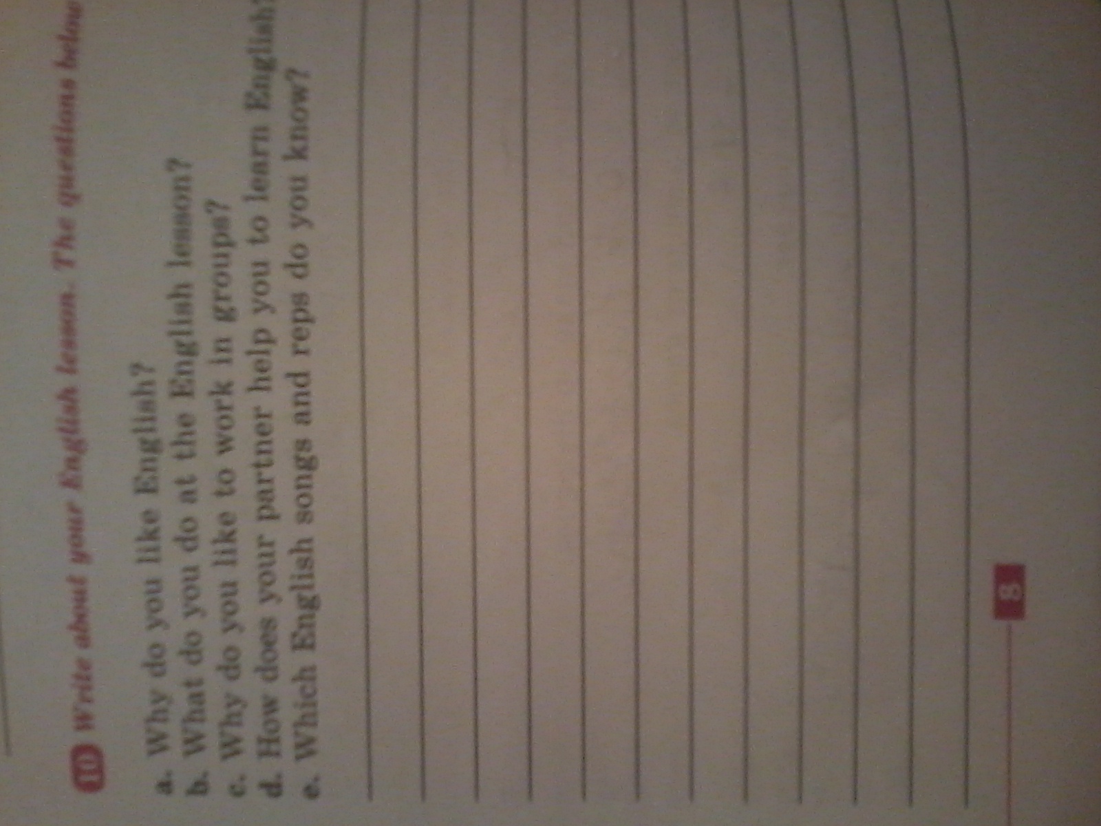 Почему вам нравится английский язык? б. Что вы делаете на английском leaаon? е. Почему вам нравится работать в группах? d. Как ваш партнер поможет вам выучить английский е. Какие английские песни и повторений вы знаете?