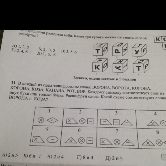 3)В схемах 2 и 7 первый и второй элементы одинаковы, а значит это слова ВОРОНА и ВОРОТА, значит исходя из пункта 2) 7 схема - это слово ВОРОТА, а 2 схема - ВОРОНА, значит 6 схема - это КОРОНА.