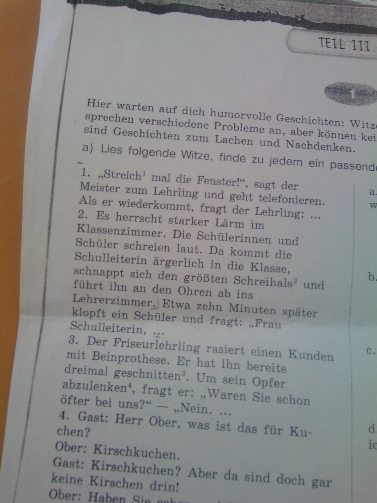 1. "Покрась-ка окна!" - сказал маляр своему ученику и ушел разговаривать по телефону. Когда он вернулся, ученик спросил его: "Meister, ich bin fertig mit den Fenstern. Soll ich auch die Rahmen streichen?" (то есть: "Мастер, я закончил с окнами. А рамы тоже красить?").