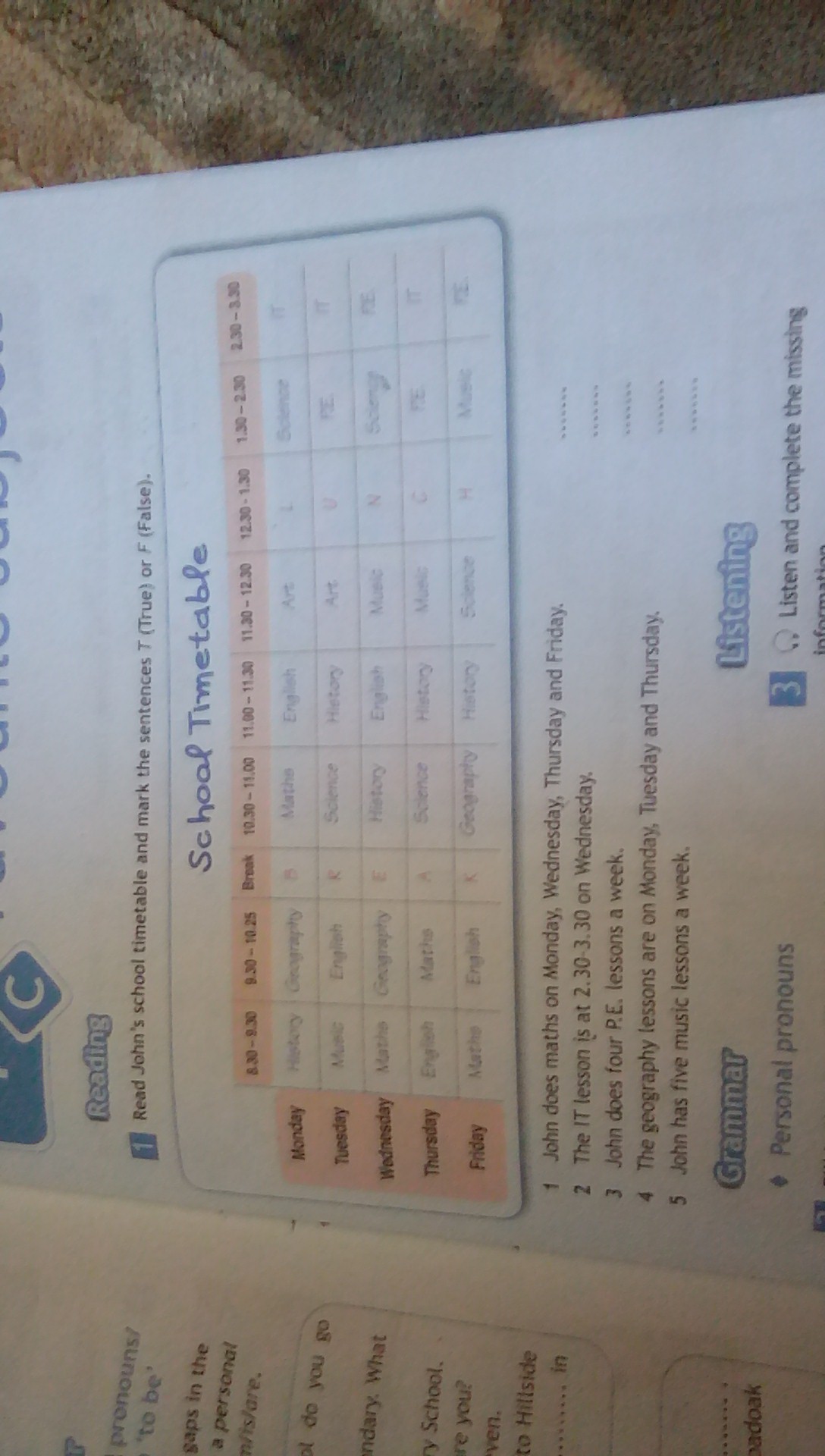 Вот перевод предложений: 1)Джон делает математику в понедельник, среду , четверг и пятницу.