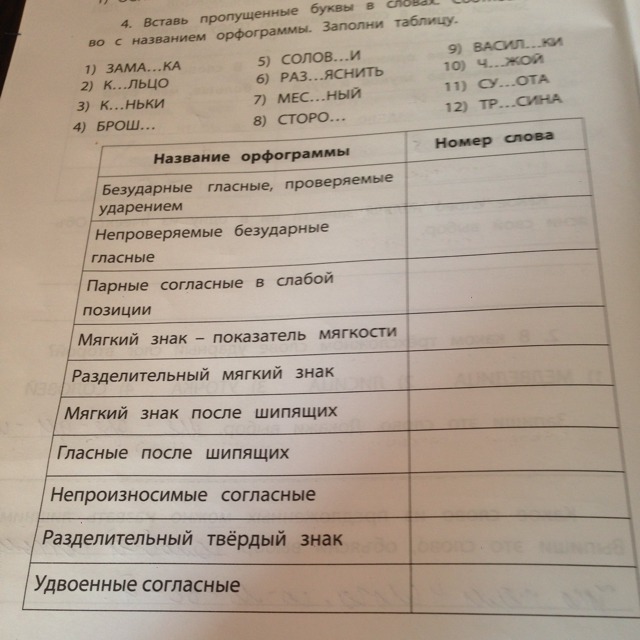1 - парн. согл., 2 - безуд. гласные проверяемые, 3 - непроверяемые гласные, 4 - Ь после шип. 5 - разд. Ь, 6 - разд. Ъ, 7 - непроизнос. согл, 8 - парн. согл. 9 - показатель мягк. Ь, 10 - гласные после шип. 11 - удв. согл 12 - безуд. гласные проверяемые.
