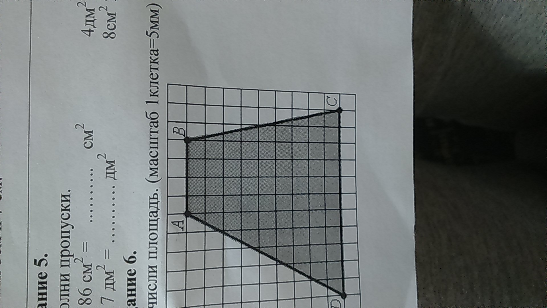 Площадь фигуры = 36+22,5+9=67,5кв.кл, с учетом масштаба 1687,5кв мм или 16,875кв.см