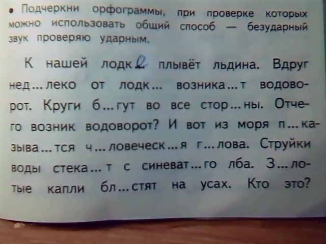 Вдруг недалеко от лодки возникает (1 спряжение) водоворот. Круги бегут (в разных случаях имеет разное спряжение) во все стороны. Отчего возник водоворот? И вот из моря показывается (1 спряжение) человеческая голова. Струйки воды стекают (1 спряжение) с синеватого лба. Золотые капли блестят (1 спряжение) на усах. Кто это? Тюлень. Морской заяц.