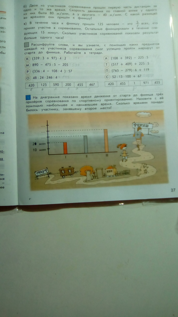На диаграмме показано время движения от старта до финиша трёх призёров соревнования по спортивному ориентированию.Назовите с её помощью наибольнее и наименшее время.Сколько времени понадобилось участнику, занявшиму второе место? Это суть помоги пожалуйста