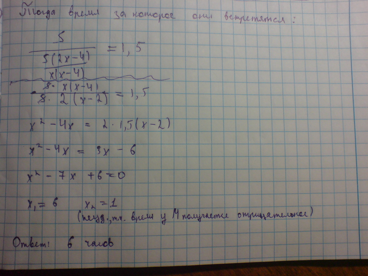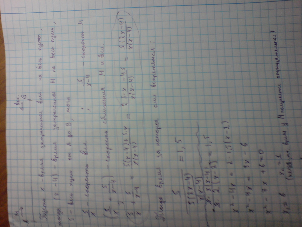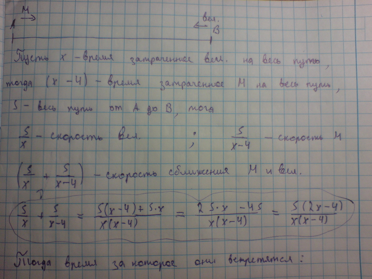 из городов А и В навстречу друг другу одновременно выехали мотоциклист и велосипедист. М проехал в город В на 4 часа раньше, чем Вел приехал в город А, а встретились она через 1 час 30 мин после выезда. Сколько часов затратил на путь из города В в город А вел??