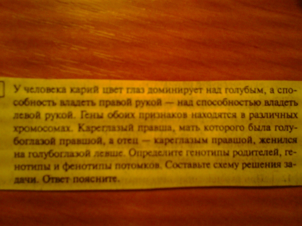 По условию задачи находим генотип мужчины, так как его мать была голубоглазой правшой (генотип ааВВ), отец кареглазым правшой АаВВ, то ( генотип их сына будет иметь вот такой вид АаВВ он женился на женщине которая имеет генотип (ааbb) оба признака находятся в рецеесивнои состоянии.
