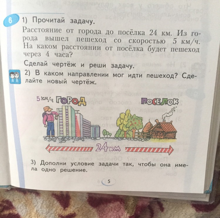Прочитай задачу.Расстояние от города до посёлка 24км.Из города вышел пешеход со скоростью 5км/ч.На каком расстоянии от посёлка будет пешеход через 4 чаа