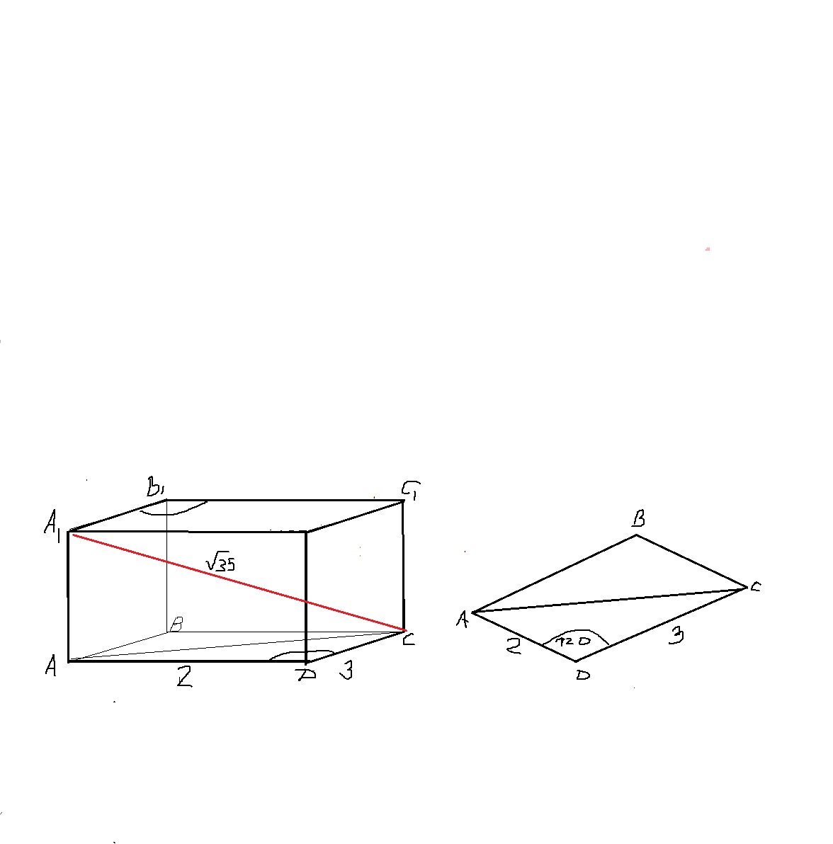 в прямом параллелепипеде ABCDA1B1C1D1 AD=2,CD=3,уголADC=120, A1C=корень из 35. найдите площади боковой и полной поверхности параллелепипеда. если можно то с рисунком