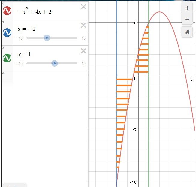 лежит ниже оси абсцисс её определённый интеграл берём со знаком ![[/tex] <br><br>[tex]D=4^2-4cdot(-1)cdot2=16+8=24,\\x_{1,2}=frac{-4pmsqrt{24}}{-2}=frac{-4pm2sqrt6}{-2}=2mpsqrt6,\\x_{1}=2-sqrt6. [/tex] <br><br>[tex]D=4^2-4cdot(-1)cdot2=16+8=24,\\x_{1,2}=frac{-4pmsqrt{24}}{-2}=frac{-4pm2sqrt6}{-2}=2mpsqrt6,\\x_{1}=2-sqrt6.](https://tex.z-dn.net/?f=%5B%2Ftex%5D+%3Cbr%3E%3Cbr%3E%5Btex%5DD%3D4%5E2-4cdot%28-1%29cdot2%3D16%2B8%3D24%2C%5C%5Cx_%7B1%2C2%7D%3Dfrac%7B-4pmsqrt%7B24%7D%7D%7B-2%7D%3Dfrac%7B-4pm2sqrt6%7D%7B-2%7D%3D2mpsqrt6%2C%5C%5Cx_%7B1%7D%3D2-sqrt6.)