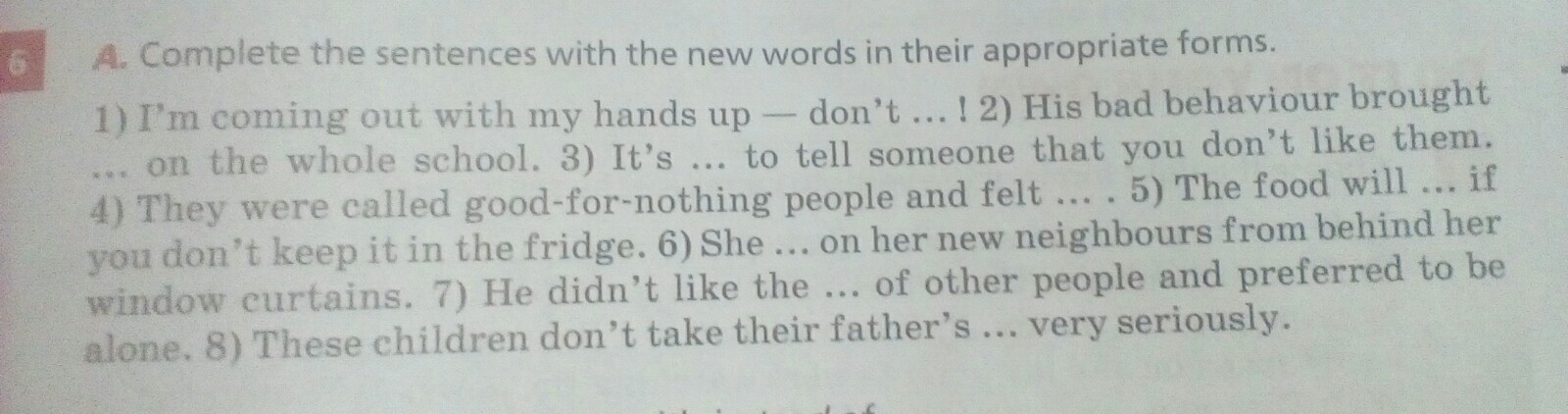 слова:himiliate, instead(of),rude,shame,shoot, society, spoil, spy, threat