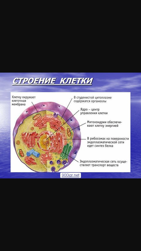 клеточная мембрана, ядро, митохондрии, рибосомы