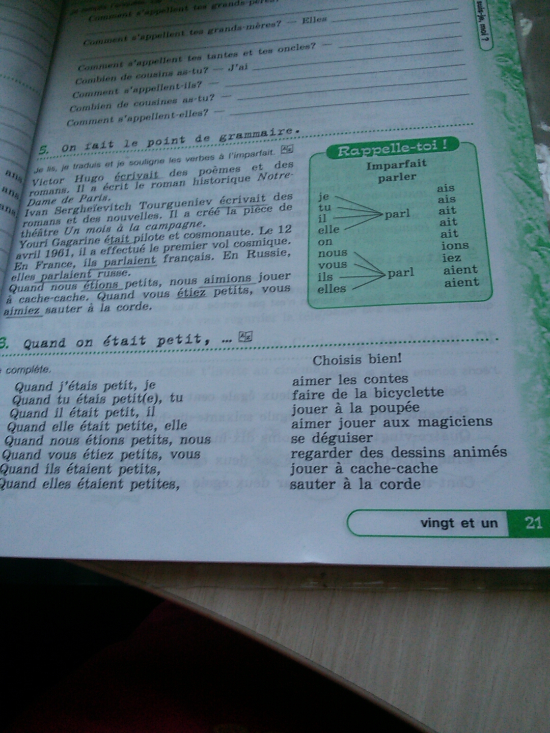J'aimais les comptes,tu regardais des dessins animés,il fait de la bicyclette,elle se déguisait en cloun, nous sautions à la corde,vous regardiez des dessins animés ,ils/elles faisaient de la bicyclette надеюсь что помогла^^