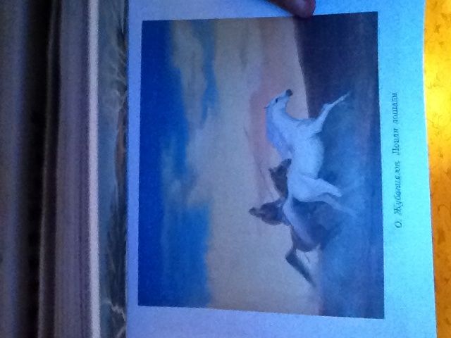 Вдруг я заметил два необычных силуэта, которые медленно и плавно приближались ко мне. Я начинал разглядывать великолепного белого коня, с прекрасно вьющейся гривой, красиво передвигаясь волнами. Мускулистое тело говорило о его могуществе. Сзади него голопировала темная лошадь. Молодой жеребец стремительно догонял "белый силуэт"... Своеобазная погоня скрылась за мрачным глухим лесом. Последние. что я смог разглядеть это решительный взмах жеребца. А дальше село солнце. И наступила ночь...