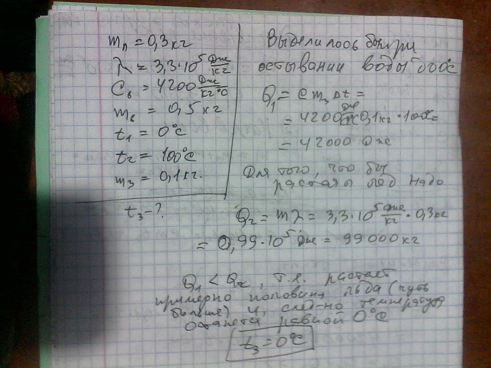 В калориметре при температуре 0°C находится вода массой 500 г и лед массой 300 г. Какая температура установится в калориметре, если долить в него 100 г кипятка? Удельная теплоёмкость воды 4200 Дж/кг°C; удельная теплота плавления льда 330 кДж/кг