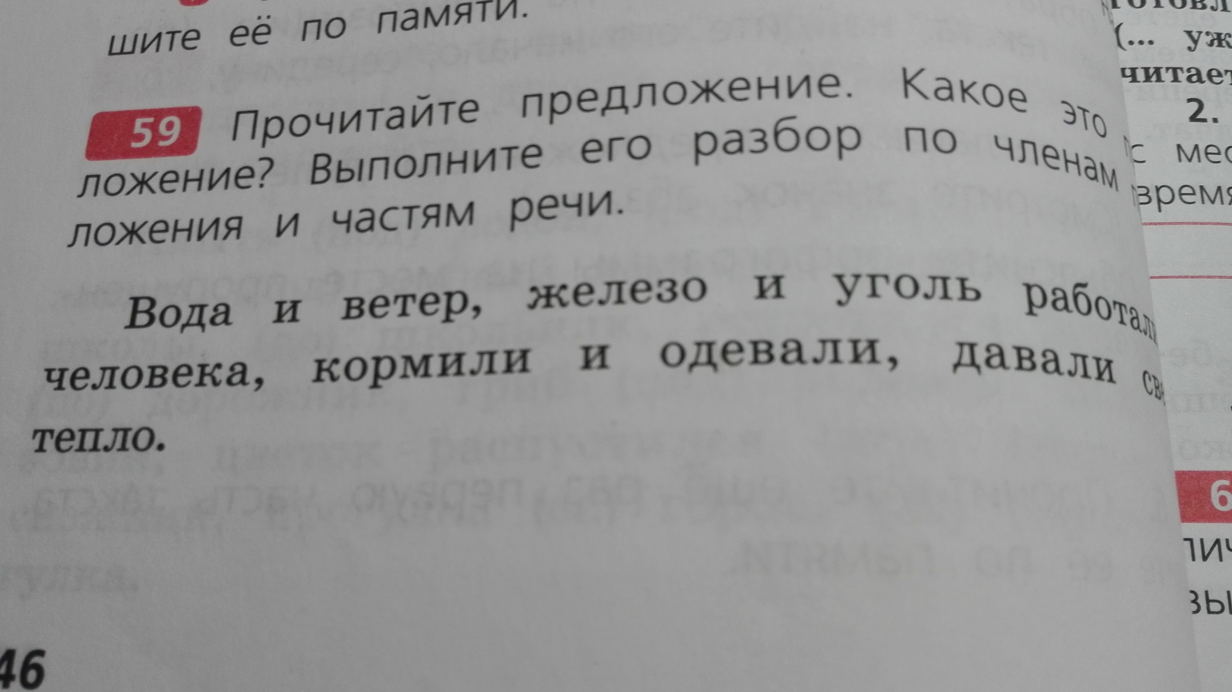 Вода,ветер,железо,уголь-подлежащие,существительные ; работали,кормили,одевали,давали-сказуемые , глаголы ; свет и тепло - тоже существительные