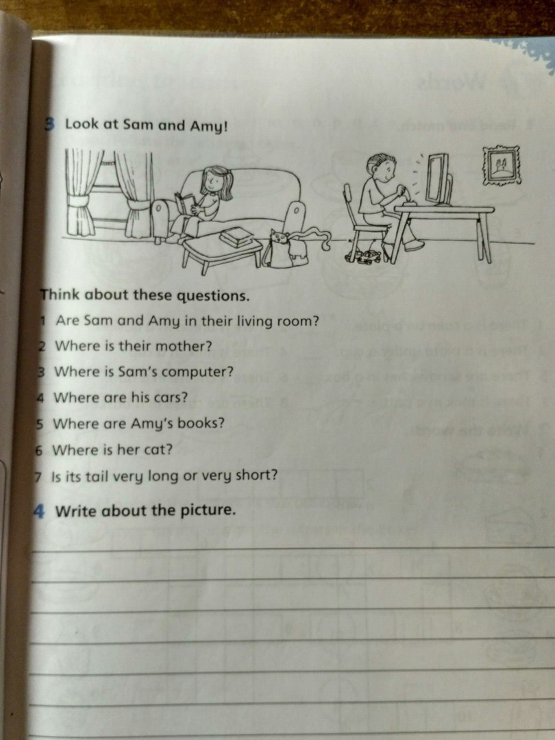 In the apartment of Amy and Sam is very comfortablle. Amy reads a book. Sam plays computer games. Cat hiding in bag.