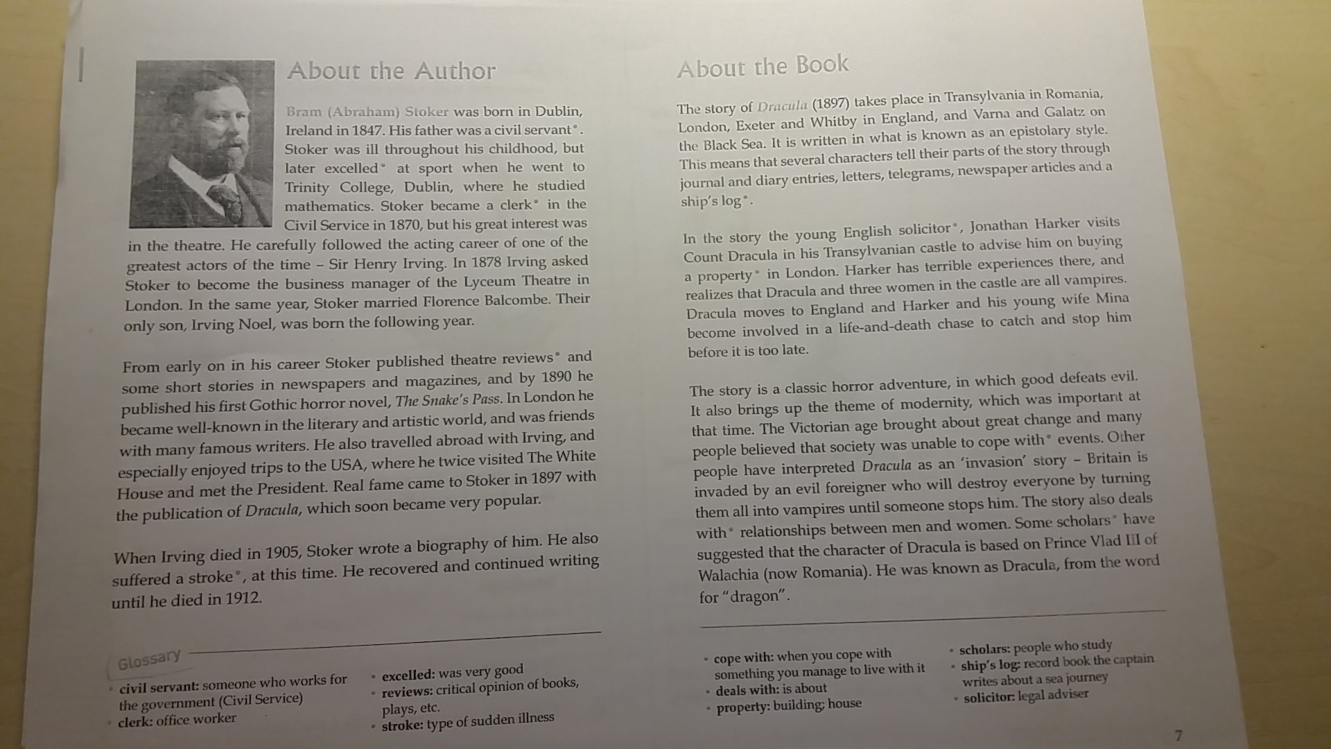 Civil servant,great interest, acting carwere, the greatest actors ,the business manager,only son,theatre reviews,short stories ,horror novel,artistic world,famous writers, epistolary style, several characters,the young English solicitor ,young wife,classic horror adventure,great change.
