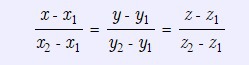 Если прямая проходит через две точки A(x1, y1, z1) и B(x2, y2, z2), такие что x1 ≠ x2, y1 ≠ y2 и z1 ≠ z2, то уравнение прямой можно найти используя следующую формулу: (Картинка)