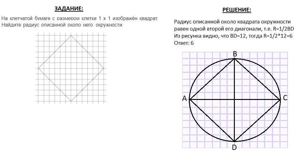 На клетчатой бумаге с размером клетки 1х1 изображен квадрат. Найдите радиус описанной около него окружности