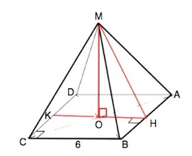 В правильной пирамиде высота проходит через центр основания. Для квадрата это точка пересечения диагоналей. МО – высота пирамиды, МН –апофема.