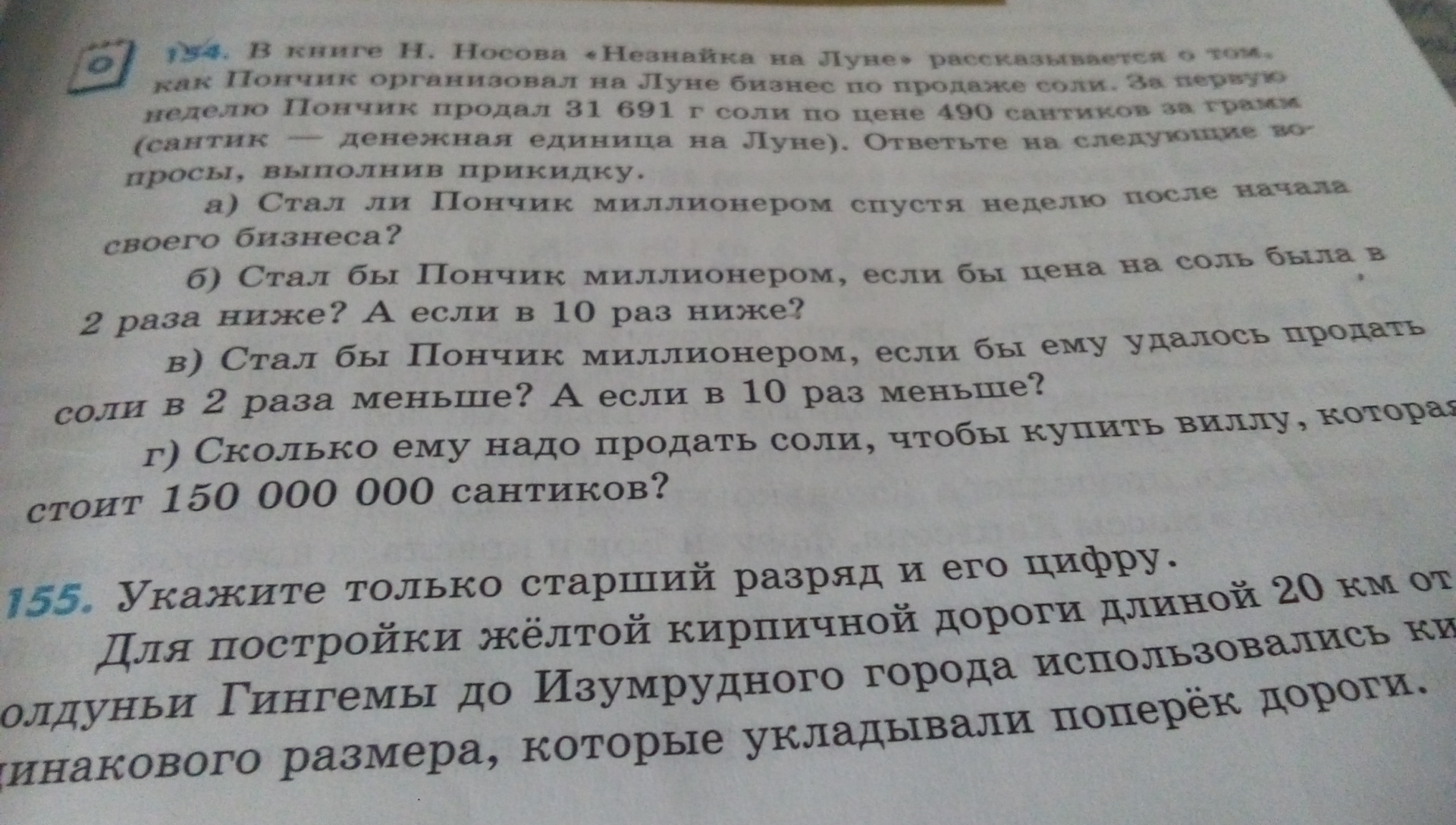 <p>В книге Н. Носова «Незнайка на Луне» рассказывается о том, как Пончик организовал на Луне бизнес по продаже соли. За первую неделю Пончик продал 31 691 г соли по цене 490 сантиков за грамм (сантик — денежная единица на Луне). Ответьте на следующие вопросы, выполнив прикидку.<br /><br />а) Стал ли Пончик миллионером спустя неделю после начала своего бизнеса?<br /><br />б) Стал бы Пончик миллионером, если бы цена на соль была в<br /><br />2 раза ниже? А если в 10 раз ниже?<br /><br />в) Стал бы Пончик миллионером, если бы ему удалось продать соли в 2 раза меньше? А если в 10 раз меньше?<br /><br />г) Сколько ему надо продать соли, чтобы купить виллу, которая стоит 150 000 000 сантиков?</p>