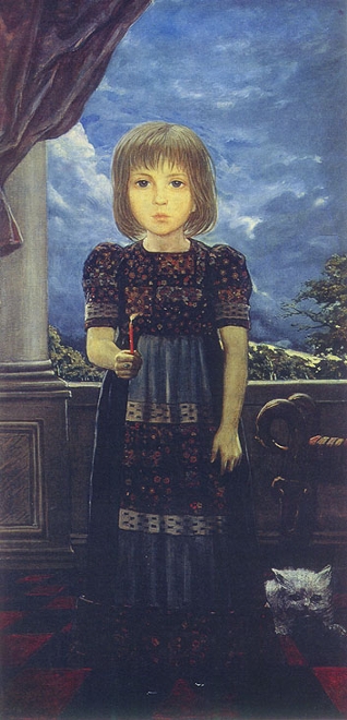 Перед нами картина И.Глазунова " Вера". На данном портрете изображена дочка самого художника. Следует обратить внимание, что на данной картине присутствуют темные тона, что может свидетельствовать о том, что художник хотел обратить все внимание на сам персонаж, не отвлекая от происходящего вокруг.Данный сюжет показывает нам религиозность и веру, привитую с детства, с ее непоколебимой силой.
