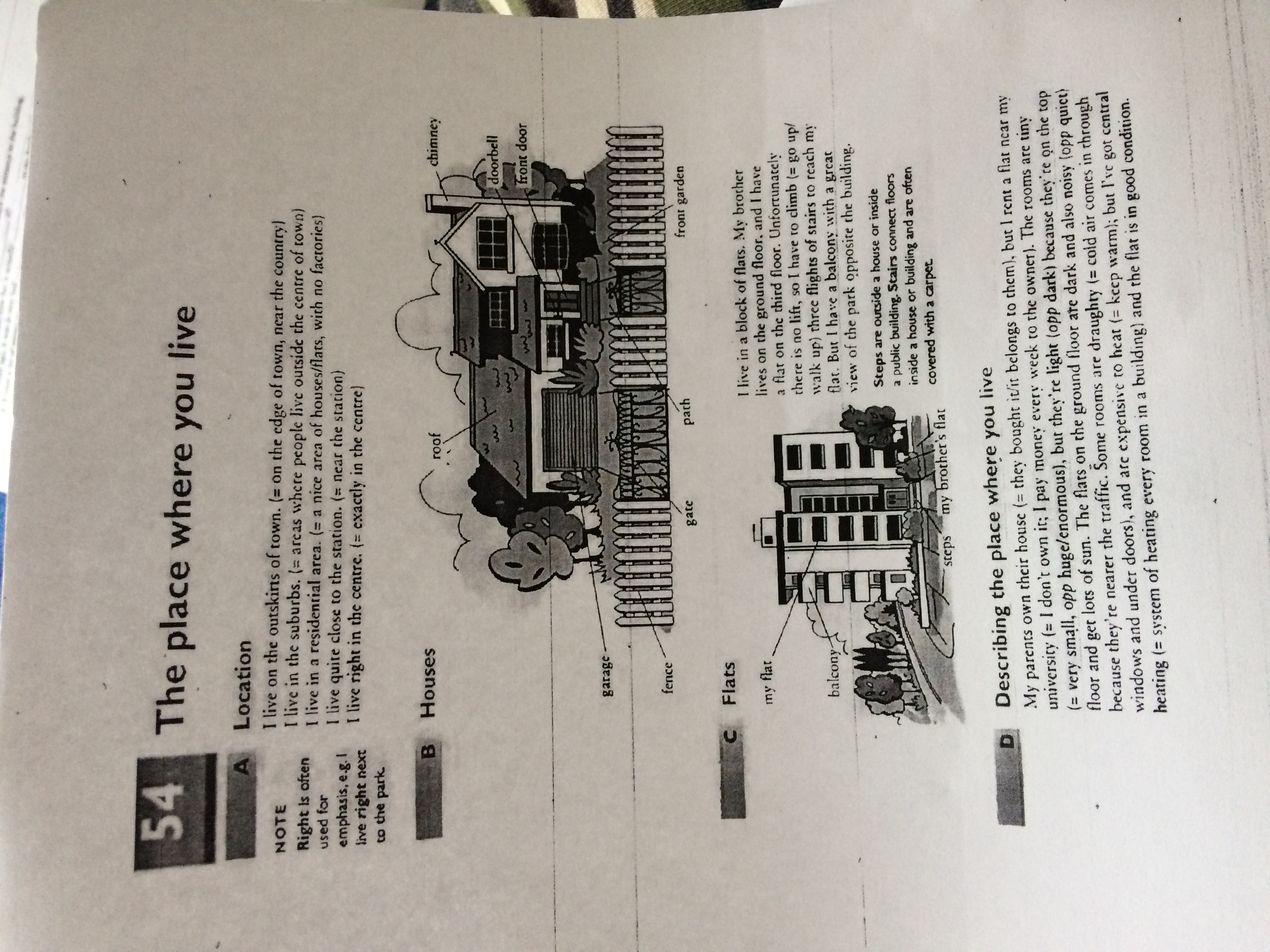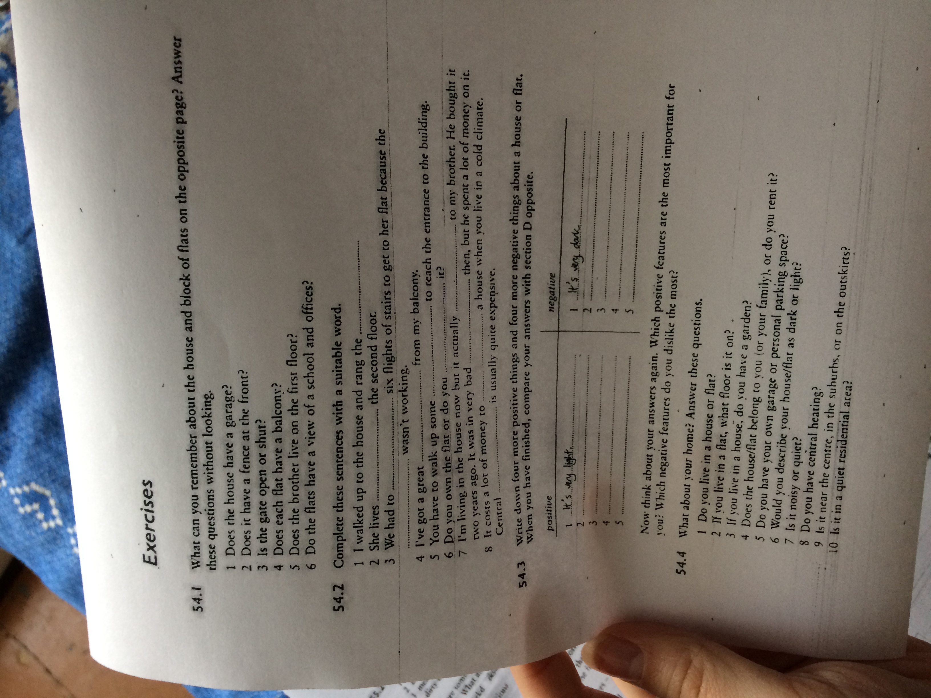 54.1) 1. Yes it does have a garage 2. Yes it does have a fence at the front 3. The gate is shut 4. It doesn't seem like every flat has a balcony 5. Yes he does live on the first floor 6. No the don't, they have a view of the park. 54.2 пишу только то, что нужно вставить) 1. Doorbell 2. On 3. Climb, lift 4. View 5. Steps 6. Rent 7. Belongs, condition 8. Heat, heating. 54.3) Positive: it's close to the university, it's in good condition, there is central heating, there is a balcony with a great view. Negative: the rooms are tiny, some rooms are draughty, it's expensive to heat, there is no lift. Вторая часть индивидуальна, отвечу по себе, может подойдет. It's very important to me that my accommodation has big, bright rooms and large windows. Also, it has to be warm and preferably in the suburb further away from main noisy roads. I absolutely dislike noisy areas and noisy neighbours. I also wouldn't want to live on the ground or the first floor. 54.4 - там про себя нужнл