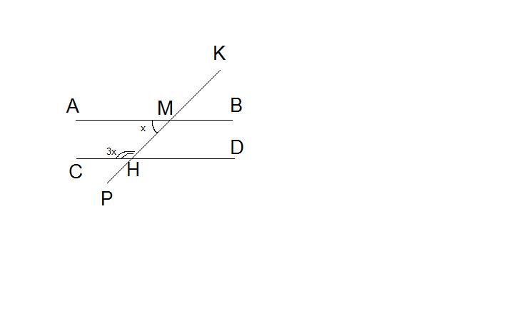 Прошу вас умоляю помогите,кто может!!Есле я не отдам решение этой задачи,я могу остаться на второй год!!!!!.Параллельные прямые АВ и СД пересекаются с прямой КР в точках М и Н соответственно. Угол АМН в 3 раза меньше угла СНМ. Найдите все образовавшиеся углы.