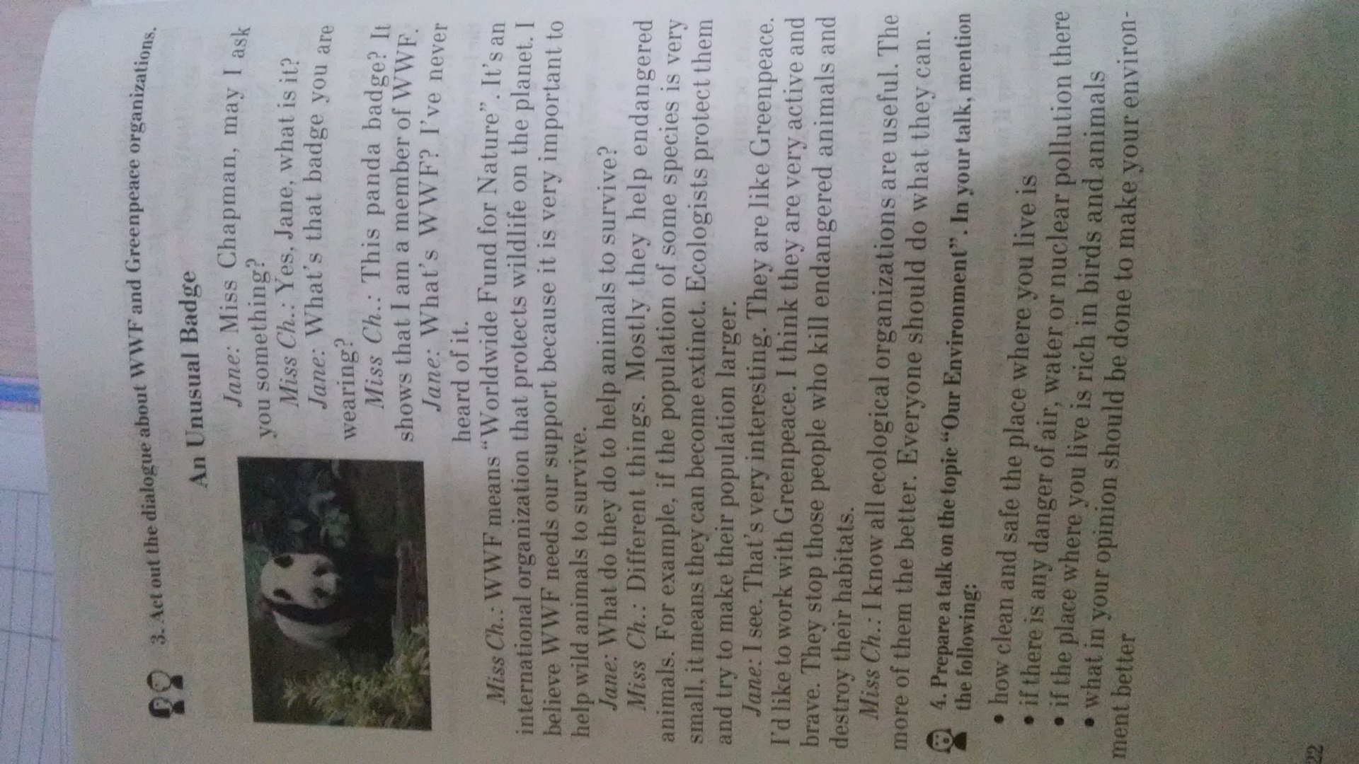 Джейн:Мисс Чахмен мей расскажите что нибудь ? Мисс Ч: да чем могу помочь ?Джейн: что это вы значок носите ?Мисс Ч: это панда.Это показывает что я являюсь чемпионом всемирного фонда дикой природы .Джейн : что это ВВФ?я никогда не слышал об этом.Мисс Ч: ВВФ означает ,что это международная организация которая защищает дикую природу на планете ,я считаю что ВВФ нуждается в нашей поддержке,потому что это очень важно ,чтобы помочь диким животным севера .Джон: Всемирный фонд природы : что они делают,чтобы помочь животным севера ? Мисс Ч: по разному они помогают животным ,вот например ,если популяция некоторых видов очень мало ,это означает что они могут стать ....экология сделает населения более важной .Джон: я вижу . Все очень интересно .Они в озере Гренпиасе мне очень нравится тут работать .Атмосфера стойкая Гренпиасе .я думаю что они очень активные и храбрые . Они останавливают и людей которые убивают исчезающих видов животных и уничтожают их обитание .Мисс Ч: И они все экологически полезны ,чем больше их тем лучше .Северчане должны сделать все что они могут.