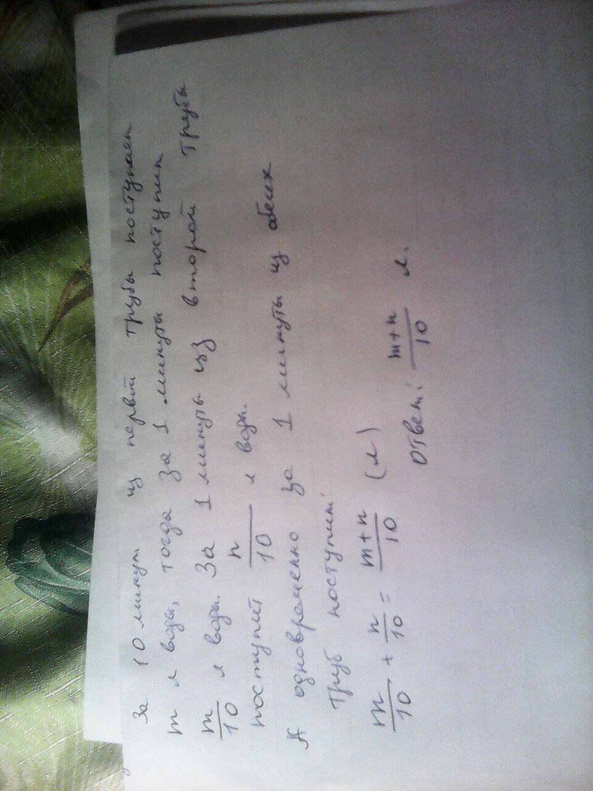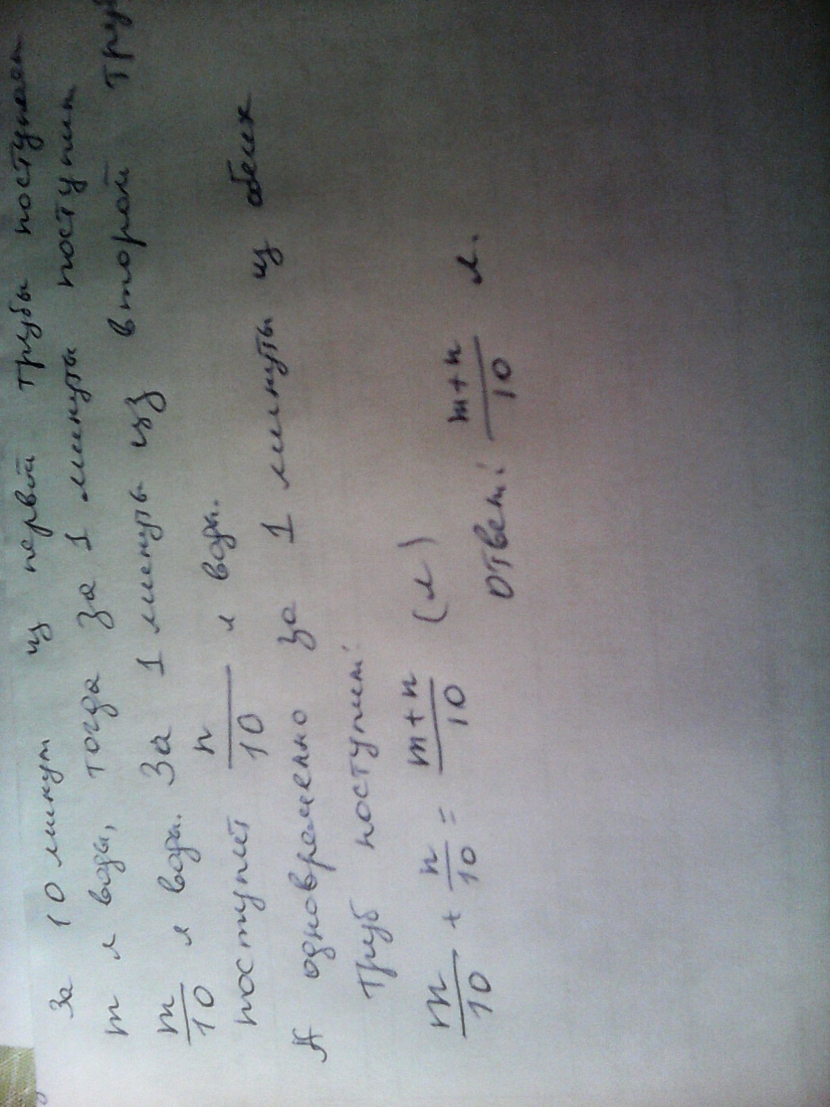 Составьте выражение по условию задачи.В бассейн за 10 минут из первой трубы поступает м литров воды,а из второй трубы-н литров.Сколько литров воды поступает в бассейн за минуту,если вода поступает одновременно из обеих труб?