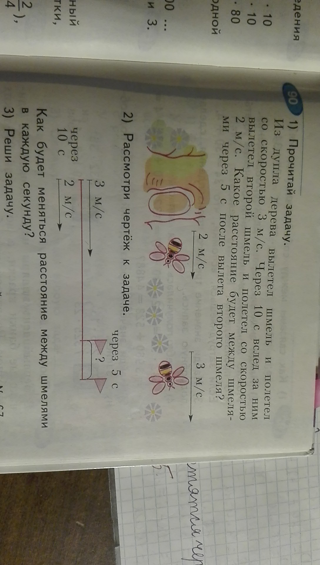 номер 90. из дупла вылетел шмель со скоростью 3 метров в секунду Через 10 секунд вслед за ним вылетел 2 шмель и полетел со скоростью 2 метров секунду . Какое расстояние будет между шмелями через 5 секунд после вылета 2 шмеля? ПОМГИТЕ пожалуйста.РЕШИТЕ ЗАДАЧУ .