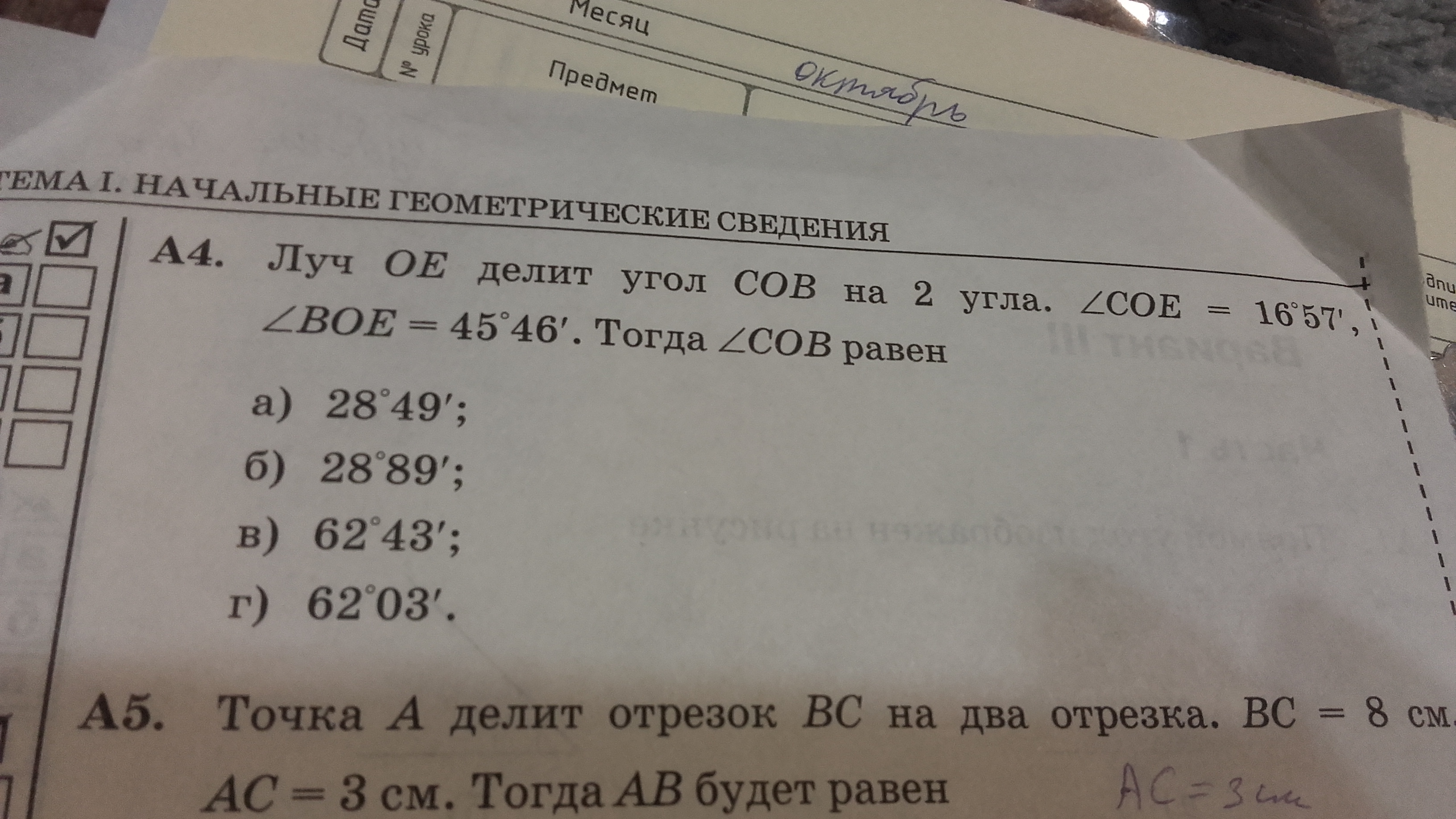 угол СОВ= у СОЕ+ у ВОЕ; у СОВ= 16 град 57 мин + 45град 46 мин ( не забываем, что в часе 60 мин) = 62град 43 мин